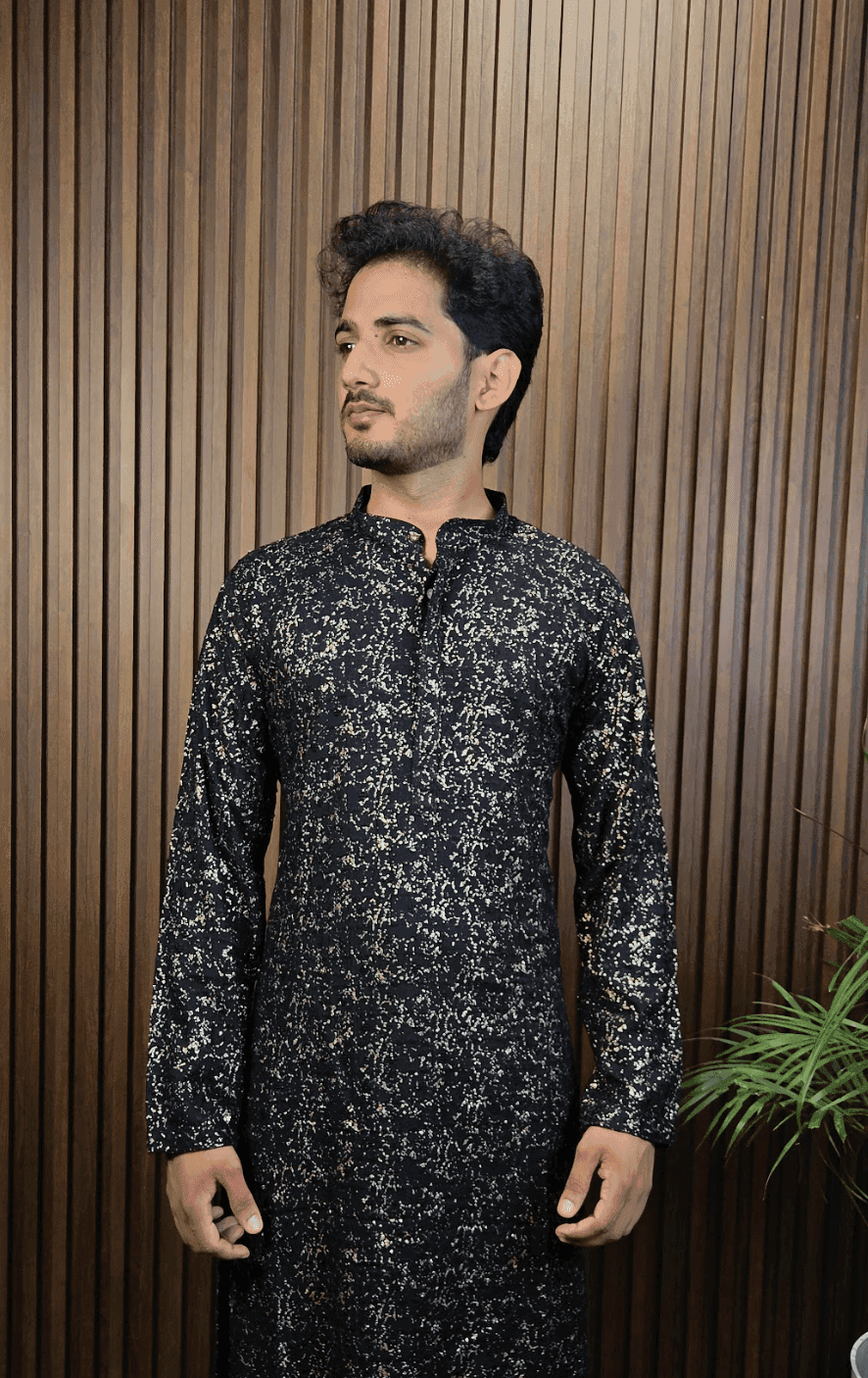 Bold and intricate embroidery on deep navy blue and black fabric, this collection adds a dazzling ethnic charm to your wardrobe. Perfect for evening events, offering a sophisticated yet striking look.